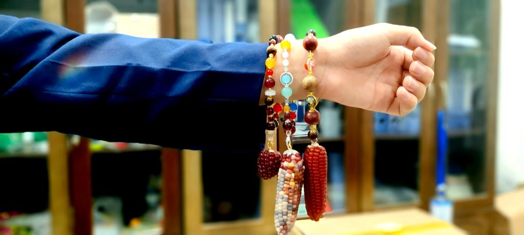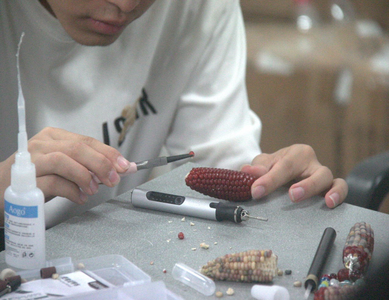 在实际操作过程中,学生们充分发挥了各自的创意与想象力。他们根据玉米的不同形态、色泽和纹理来设计和制作作品。有的学生通过对玉米进行简单的打磨和抛光来展现其天然之美;而有的学生则使用雕刻工具在玉米表面刻制复杂的图案,并通过钻孔、串线、装饰等工艺,使每件作品都独具特色。经过几小时的努力,一件件精美的文玩玉米成品在学生们手中诞生。