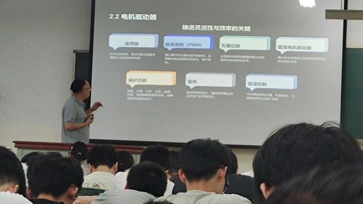 讲座中,文高工融入大量工程实践与前沿动态,分析技术挑战与突破路径,引导学生关联专业学习与职业规划。互动环节,学生就电机材料、驱动控制、检验标准及就业方向踊跃提问,文高工细致解答,其专业素养赢得师生掌声。