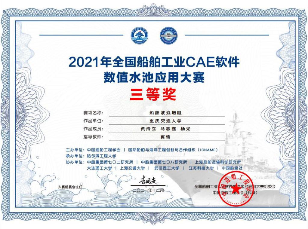近日,2021年全国船舶工业CAE软件数值水池应用大赛公布获奖名单,我校伟德bv1946三支参赛队取得二等奖1项、三等奖2项的好成绩,其中:冀楠老师指导的两支团队(1.钱志鹏、李浩然、曾倩;2.杨光、黄浩东、马忠鑫)分别获得船舶波浪增阻赛项全国二等奖和三等奖;石伏龙老师指导的团队(李洪鑫、苏宇童、杨晶惠)获得海工平台摇荡赛项全国三等奖。