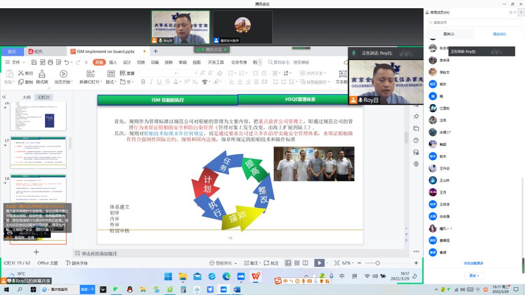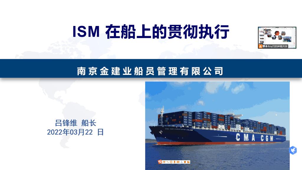 2022年3月29日,南京金建业船务有限公司培训主管吕锋维船长受邀为我院师生带来一场题为“ISM Implement onBoard”的线上专题讲座。