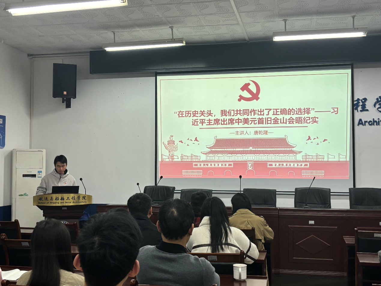 根据学习贯彻习近平新时代中国特色社会主义思想主题教育相关工作部署,11月29日,航运与船舶工程学院研究生党支部以《在历史关头,我们共同作出了正确的选择》为题召开支部书记讲党课活动。支部教师党员、学院学科办主任彭中波教授到场指导,支部委员、党员、预备党员及部分发展对象参加学习。