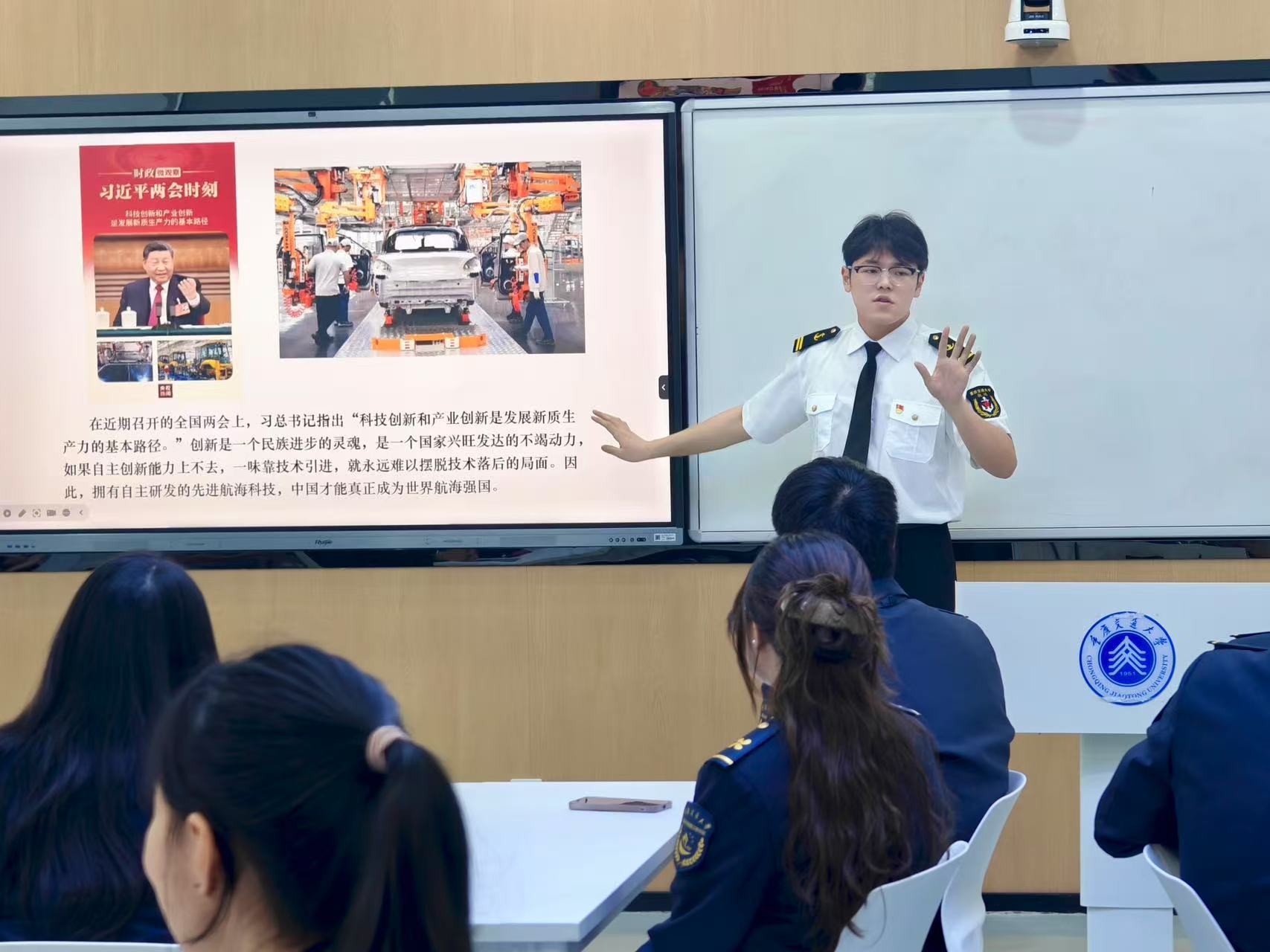 活动伊始,本科生第二党支部成员们通过详实的史料和生动的案例,系统回顾了从古代“海上丝绸之路”到现代“一带一路”倡议下的中国航海发展历程,重点展示了我国航海科技领域取得的重大突破。结合2025年全国两会精神,支部成员深入解读了习近平总书记"科技创新和产业创新是发展新质生产力的基本路径"的重要论述,并以"梦想"号深海探测、南极秦岭站建设、妈祖海洋数值预报模式等重大科技成果为例,阐释了我国海洋科技向智能化、无人化和数字化发展的显著成就。