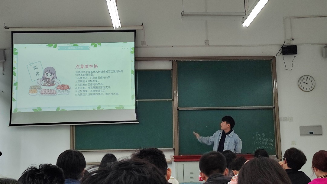 为了更好地服务于同学,促进我院全体学生的健康发展,许于桃同学引领大家进入了大学生心理健康学习,详细分析了大学生心理健康的现状,分享了缓解心理压力的方法,最后还以小游戏的方式,引导大家对自己的心理状态和性格情况进行评估,活跃了会场氛围,给参会人员都留下了深刻的印象。