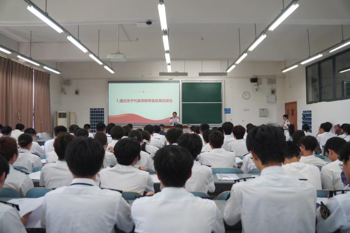 学生会主席团成员李雨桐以《党旗引领航运未来,青春筑梦蓝色海洋》为题作了工作报告,系统回顾了过去一年学生会在丰富校园文化、促进学风建设等方面取得的成绩,也分析了存在的不足,并提出了新的工作思路和具体目标,旨在更好地服务学生,促进学生全面发展。