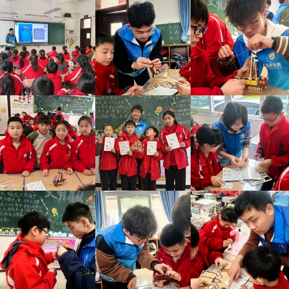 实践环节中,科普团特别设计了"共拼船模"活动。在大学生们的指导下,孩子们分成小组,动手拼接船模零件,体验船舶结构设计的奥妙。从龙骨搭建到甲板组装,从桅杆固定到船帆调试,同学们在协作中感受工程实践的乐趣。当一艘艘精致的船模在课桌上"扬帆起航"时,教室里响起了欢呼声和掌声。