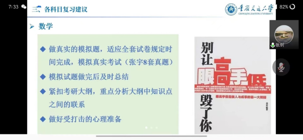 考研进入冲刺期,这个阶段该如何做?为了让同学们进一步了解研究生入学考试冲刺阶段的备考技巧和注意事项,疫情期间更合理地安排复习计划,伟德bv1946党委轮机与船电教工党支部主动策划,来自哈尔滨工程大学的张钊博士和毕业于浙江大学的唐烽博士以自身经历向同学们讲述了考研路途中的心路历程和实战经验。张钊博士分享了自己的各科备考经验,并特别强调“单科不过线无法进入复试”,现阶段大家更应该合理分配四科学习时间,注重每一科的学习。唐烽博士分科目向同学们讲解了备考过程中应关注的多个板块,各板块中的问题以及解决方法。例如,在英语科目中,唐老师讲到“真题是根本”以及“根据自身情况准备英语作文”。唐老师还谈到了“恐惧源于未知”,在目前阶段同学们要做好每日规划、模拟考试演练、关注考试注意事项,及时总结经验。唐老师还将自己精心归纳总结的英语写作资料分享给大家。老师们的成功经历让考研同学深受鼓舞,对即将到来的大考充满信心。