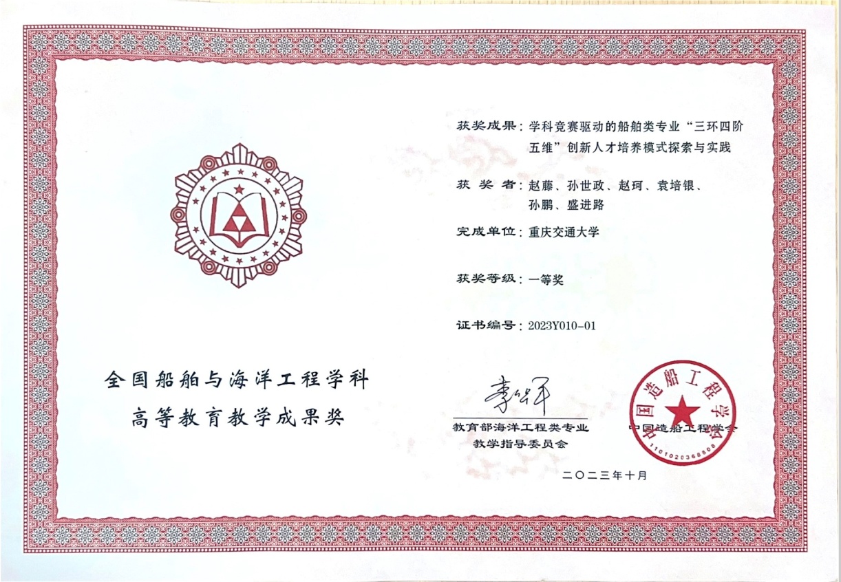 近日,教育部海洋工程类专业教学指导委员会和中国造船工程学会联合公布了2023年度全国船舶与海洋工程学科高等教育教学成果奖评审结果。伟德国际victor1946航运与船舶工程学院大学生创新实践中心主任赵藤老师领衔申报的“学科竞赛驱动的船舶类专业‘三环四阶五维’创新人才培养模式探索与实践”(完成人:赵藤、孙世政、赵珂、袁培银、孙鹏、盛进路)喜获教学成果一等奖,实现近年来我校该奖项历史性突破。
