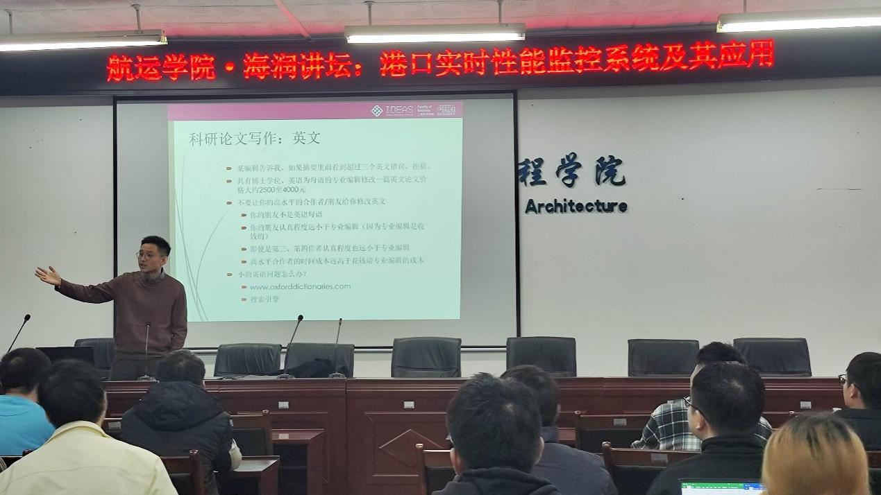 学术讲座中,杨冬教授介绍了其团队在航运领域的相关研究内容,包括利用AIS数据来准确预测锚地和泊位等,重点围绕《港口实时性能监控系统及其应用》进行分析讲解,强调了以问题为导向的研究思路。同时杨冬教授结合自己丰富的科研经验和工作背景,围绕选题、寻找研究的契合点、SCI论文写作等内容进行了分享。现场师生认真仔细聆听了杨冬教授的学术报告,并进行了热烈的交流讨论。