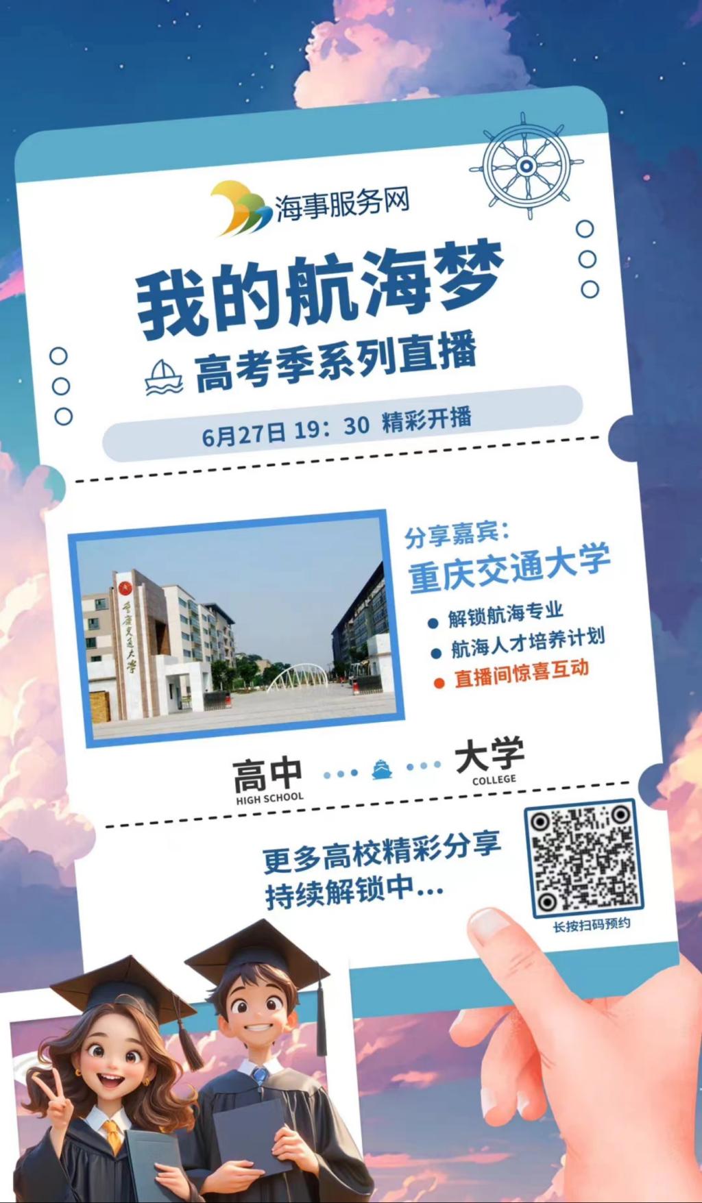 在高考志愿填报的关键时期,由海事服务网精心策划的“我的航海梦”高考季系列直播活动于6月27日晚19:30迎来了高潮——伟德国际victor1946深度分享专场。本次直播活动不仅吸引了来自大连海事大学、上海海事大学等国内顶尖航海类院校的积极参与,伟德国际victor1946航运与船舶工程学院也应邀并积极参与了该项活动,为怀揣航海梦想的学子们点亮前行的灯塔。