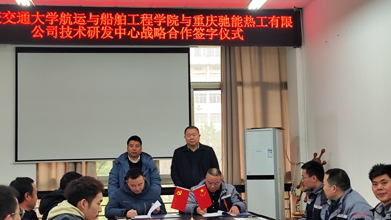 2024年1月17日上午,航运与船舶工程学院与重庆驰能热工设备有限公司技术研发中心战略合作签字仪式在我校成功举行。航运与船舶工程学院院长盛进路、党委副书记王东,重庆驰能热工设备有限公司董事长杨壮志,总经理罗清锋,以及校企双方专家教授、技术人员代表汪亚等人出席签约仪式并交流。